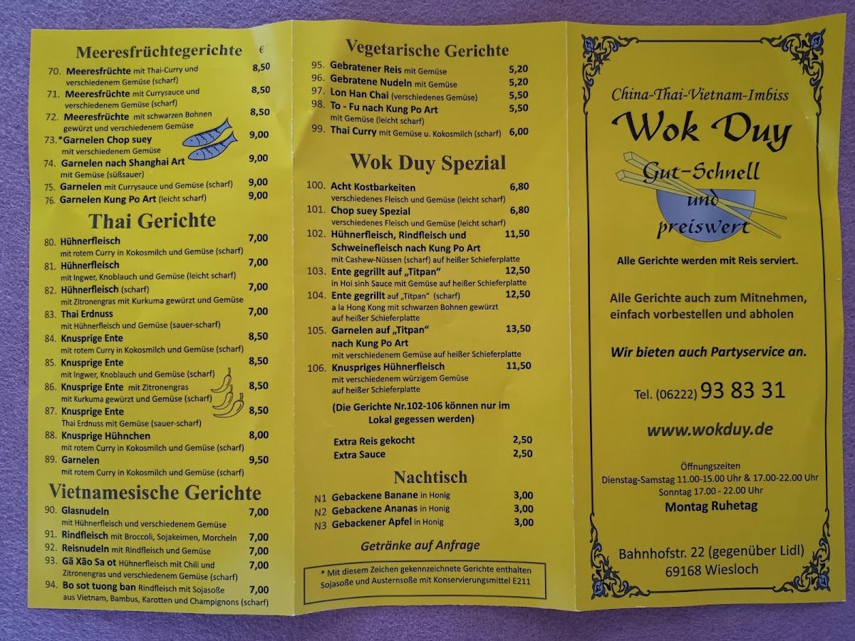 Welcome to Wok Duy, your go-to spot for a delightful Asian culinary experience in Wiesloch. Nestled at Bahnhofstraße 22, this establishment is known for its quick, simple, and affordable meals that cater to busy lifestyles.